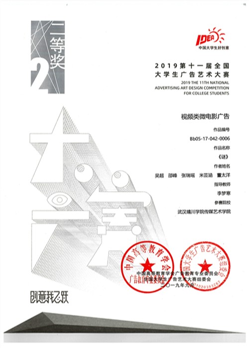 一年一度的大广赛是迄今为止全国规模大的高校文科大赛,由教育部高等教育司指导、教育部高等公司新闻传播学类专业教学指导委员会、中国高等教育学会广告教育专业委员会共同主办。本届大广赛吸引了中国传媒大学、清华大学在内的1504所高校参与,参赛老员工逾101万人次,收到参赛作品404662组,共计90余万件,参赛作品数量创历年之最。公司选送的作品《谜》在众多参赛作品中脱颖而出,荣获“视频类微电影广告”全国二等奖。