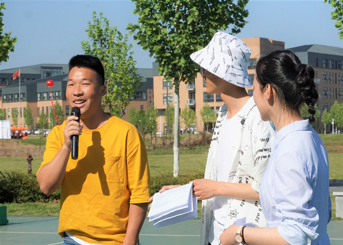 联谊活动正式开始之前,主持人带领大家走向了排球场,两院同学以主持人为中心,围成一个大圈,继续后面的环节。这个环节由几个小游戏构成,参与者将会得到一定的奖励,这需要台上台下的高度互动。第一个游戏是听歌识曲,主持人放音乐,圈内人可抢话筒说歌名,并唱出来。有人甚至在主持人还没来得及倒数之前就上台抢走了话筒,场面一度很热闹。第二个游戏是用打气筒给气球充气,气球最大最快者胜。气球充气膨胀后易爆,台上的气球也少有幸免,两轮下来,满地气球碎屑。第三个游戏是百变身形大比拼,台上六个人用身体摆出一个单词由观众猜。台上的同学将身体做出各种形状,试图摆出易懂的英文字母。这个游戏比之前的难度略大一点,观众猜单词所用时间也多一点,欢乐自然要多一些。