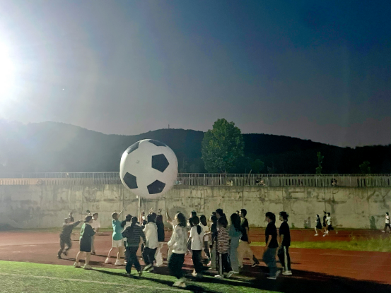 二、球球推推乐。每一个集体都拧成一股绳,大家的目光紧紧跟随充气足球一点一点的移动,这推动的不仅仅是我们对胜利的渴望,更是各班形成的班级荣誉感与集体责任意识。每个人都伸出双手,为班级的进步与发展贡献自己的力量。充气大足球就好似我们每个人心中的郁闷情绪,同学们心中的烦恼也随着足球的移动被退开。大家在欢声笑语中驱赶负面情绪,感受到团结合作的力量!