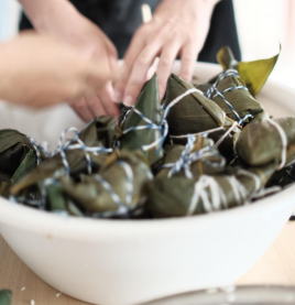 万众一心,众志成城。在包粽子的过程中,同学们都有模有样,先将手中的粽叶叠放在一起,再圈出一个圆锥,倒入一些糯米。随后,根据同学们各自的喜好,有人选择放入一个咸蛋黄,有人则放入卤肉,也有喜欢吃清水粽的,则什么也不加。很多同学都是第一次包粽子,大家一边交流包粽子经验技巧,一边互相帮助裹粽子。一个、两个、三个……大家在欢笑声中包出了满满一盆粽子。