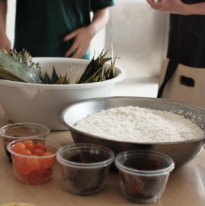 活动开始,各项流程有序进行,班委们将材料及制作道具带到现场,同学们也陆续到场,并开始了独具匠心的粽子“创作”。