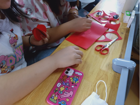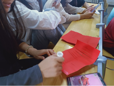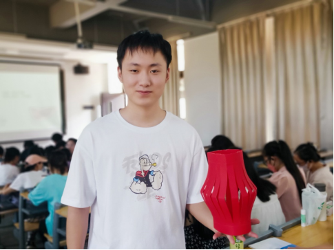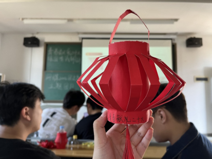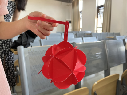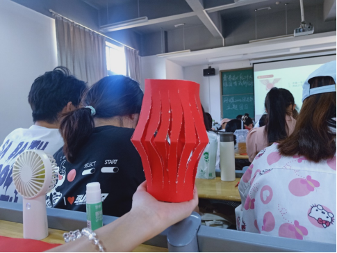 经过三个方面的了解后,进行活动第四项——巧手制灯笼。为贯彻绿色环保的理念,同学们除了使用红色卡纸、剪刀、固体胶等工具外,还使用了空的矿泉水瓶进行创意灯笼的制作。一张张A4大小的红色硬卡纸在剪刀的裁剪中,在乳白色的固体胶的粘合下,不同形状不同大小的红卡纸产生了不同的组合形式,约历时一小时,各式各样精美的灯笼在同学们的指尖诞生了。