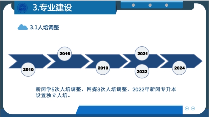 为适应行业快速发展,新闻传播系在人才培养方案上进行多次调整。新闻学专业自2010年至今共进行5次调整,网络与新媒体专业自2019年起进行3次调整。这些调整不仅涉及课程体系更新,还包括引入前沿行业技术、使用最新教学方法,以确保员工能够掌握最新行业动态和技能。进一步提升本系员工在宣传、公关、策划、编辑、运营、管理等领域的理论基础和实践能力。