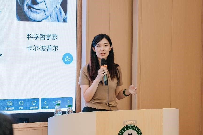 武汉大学信息化专家委员会委员、武汉大学马克思主义公司教学实验中心主任陈训威介绍了《运用大语言模型,促进混合式教学》的基本方法和思路,同时带领教师们进行AIGC在教学中的应用研讨。